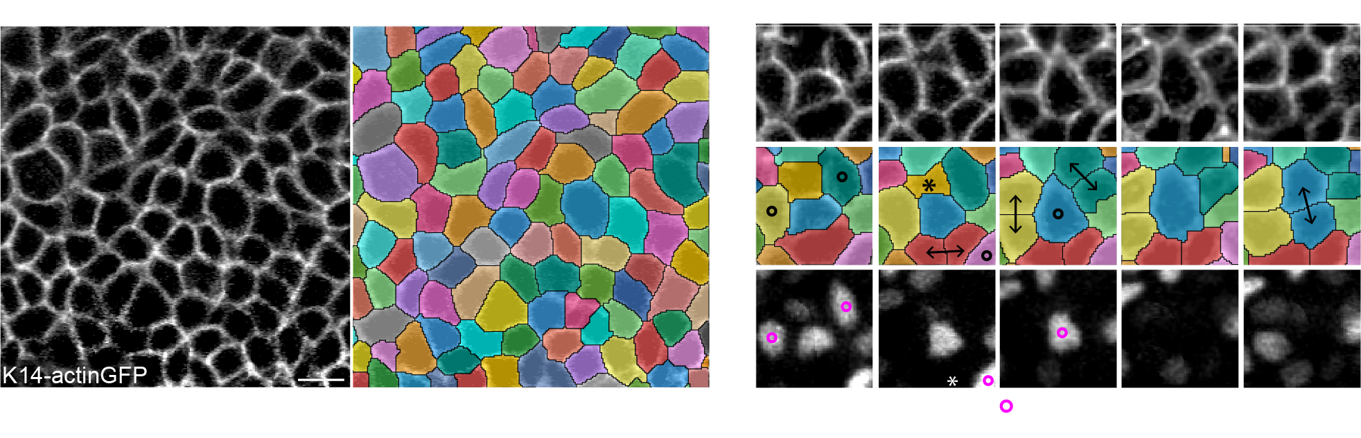 Representative images showing the segmentation of basal cells based on the cortical K14-actinGFP signal. Representative example of an individual basal cell increasing in area concurrent with a neighbor differentiation, losing the G1 reporter (mKO2-hCdt1(30/120)) signal, and dividing over the course of 48 hr.